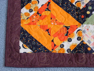 This was super easy to make...a Pumpkins Gone Wild jelly roll, the Cozy Quilt Strip Tube Ruler and free directions to make the Daniela block. My LAQ quilted with pumpkins!!! Detail of quilting: